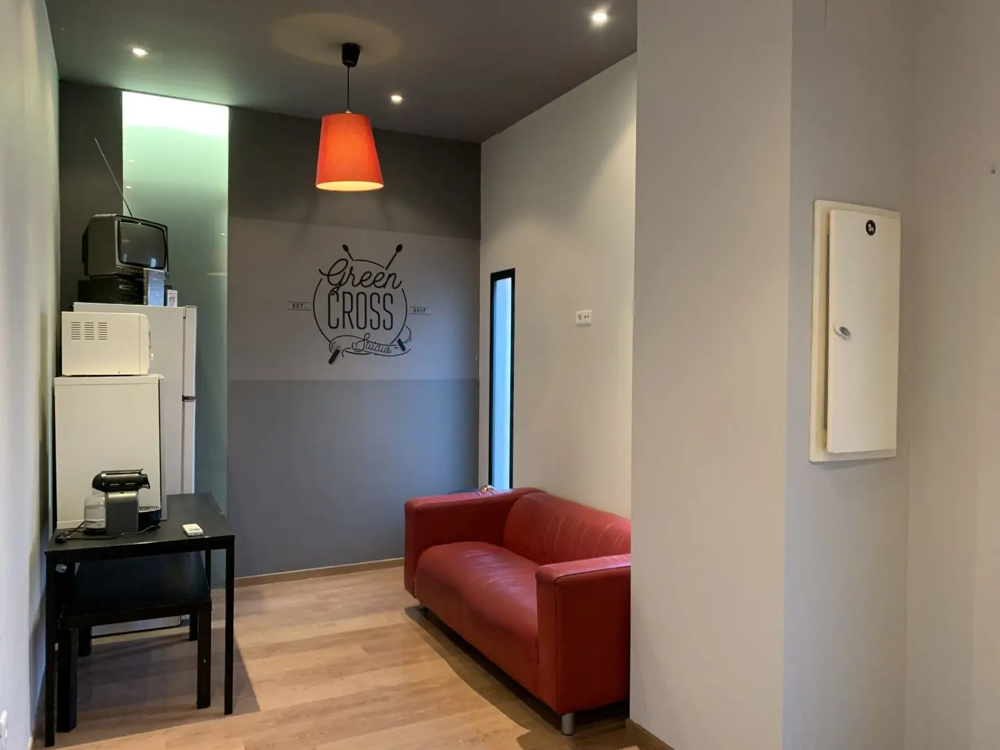 Un recibidor con sofá y sillones donde poder sentarse a descansar, nevera, maquina de café. Esta zona se utilizará para descansos durante los procesos de grabación, mezcla o cualquier otra actividad realizada en las otras dos salas.