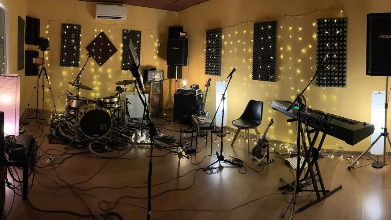 La Sala de Grabación es muy amplia y está adecuada para grabaciones de baterías, percusión, voces, instrumentos de viento, guitarras acústicas, en definitiva cualquier fuente sonora. Mediante dos puertas de aislamiento acuático y un cristal doble conseguimos que la fuente sonora este totalmente aislada de la sala de control.
